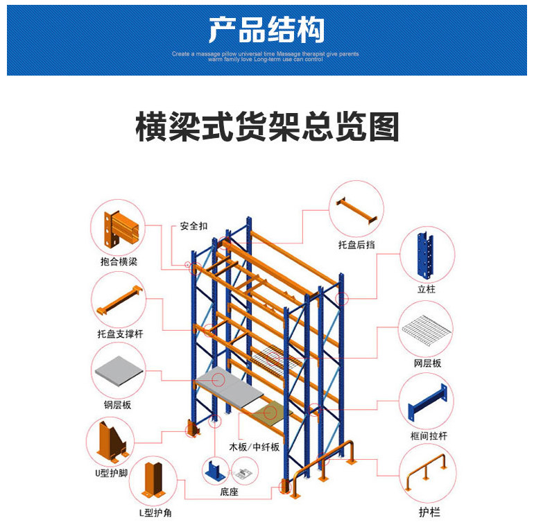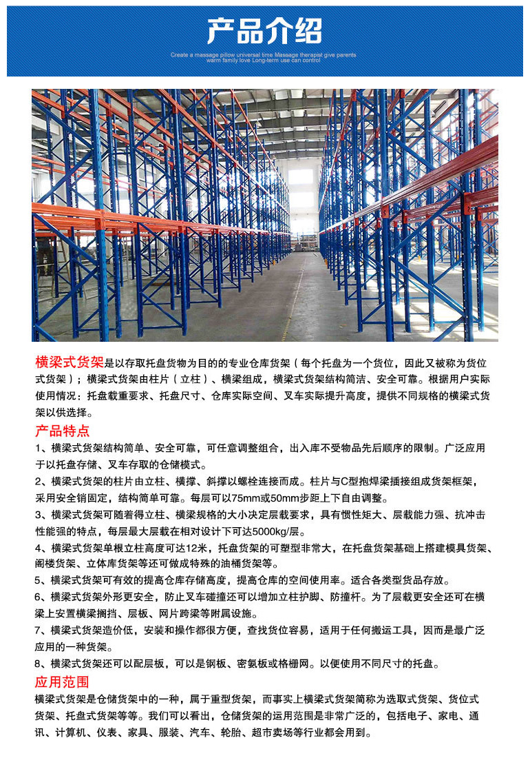 重(chóng)型貨架主(zhǔ)要特征 ■通常貨物(wù)通過托盤、倉(cāng)儲籠等單元集裝(zhuāng)設備整裝後存入貨架保管。每單元載重一般在2000kg以內,每層通常放兩個單元。 ■是較普遍(biàn)和廣泛使用的貨架之一,適合絕大多數倉庫或產品貨物使用。 ■具有100%的(de)貨物任意揀選特性。搬運機械如叉車等可到達任意貨位進行存儲作業,存儲作業方便、快捷(jié)! ■以機械搬運設備進行存儲作業(yè)。 ■單元(yuán)貨架跨度一般在4m以內,深(shēn)度在1.5m以內,低、高位倉庫貨架高度一般在12m以內,超高位倉庫貨架高度一般在30m以內(此類倉庫基本(běn)均為自動化倉庫,貨架總(zǒng)高由(yóu)若(ruò)幹段12m以內立柱構成)。 ■能夠以75mm的整數(shù)倍自由調節每層層高。 重型(橫梁式)貨架一(yī)般采用冷(lěng)軋異型鋼製作,立柱由80(90)x60(70)Ω型鋼表麵衝菱形孔而成,橫梁由80x50-100x50-120x50-140x50-160x50抱(bào)焊梁連(lián)接掛(guà)件而成(chéng),一般用托盤代替層(céng)板方便叉車(chē)搬運。層載重1噸到5噸的設計,表麵靜電噴塑(sù),防水防鏽防腐蝕能力更(gèng)強,安全係數高,插接式組合,不需要用(yòng)螺絲和焊接,組裝非常方便(biàn),充分利用空間麵積,提供倉儲能力。