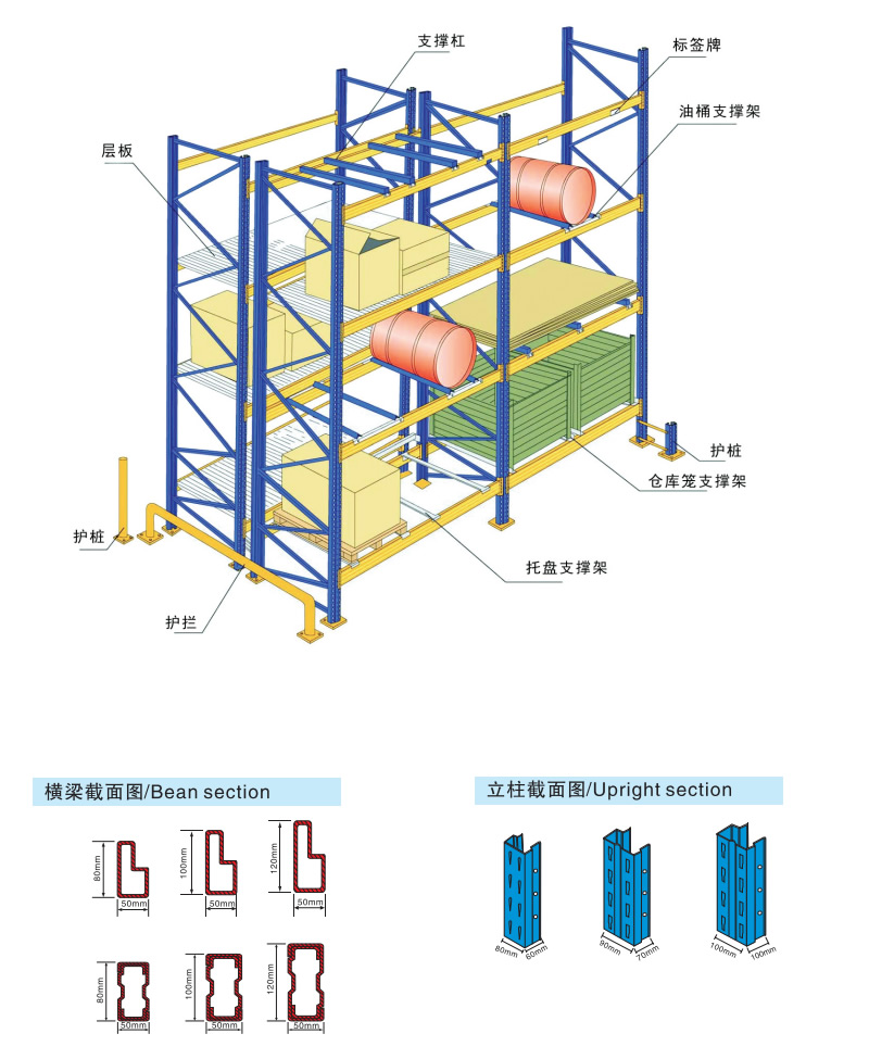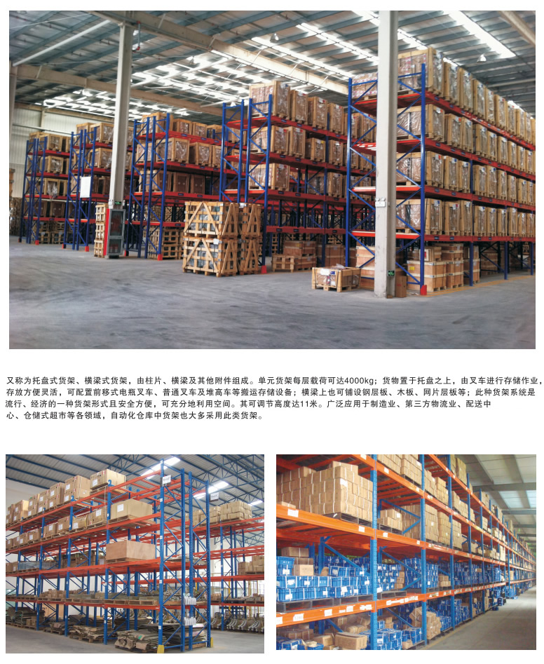 | 重型貨架,又俗稱橫梁式貨架,或稱貨位式貨架,屬於托盤貨架類,在國內的各種倉儲(chǔ)貨架係統中為常見一種貨架形式(shì)。以立(lì)柱(zhù)片+橫梁形式的(de)全組裝結構,結構簡明有效。可根據存儲單元(yuán)集裝設備的特(tè)性(xìng)加裝如:隔檔、鋼層板(木(mù)層板)、金屬絲網層、倉(cāng)儲籠導軌(guǐ)、油桶架等功能性附件。滿足不同(tóng)單元集裝(zhuāng)設(shè)備形式的貨物存儲。 重型貨架(jià)主要特征 ■通常貨(huò)物通過托盤、倉儲籠等單元集裝設備整裝後存入貨架保管(guǎn)。每單(dān)元載重一般在2000kg以內,每層(céng)通常(cháng)放兩個單元。 ■是普遍(biàn)和廣泛使用的貨架之一,適合絕大多數(shù)倉庫或產品貨物使用。 ■具(jù)有貨物任意揀選特性。搬運機械如叉車等可到達任意貨位進行存儲作業,存儲作業方便、快捷! ■以機械(xiè)搬運設備進(jìn)行存儲作(zuò)業。 ■單元貨(huò)架跨度一般在4m以內(nèi),深度在1.5m以內,低、高位倉庫貨架高(gāo)度一般在12m以(yǐ)內,超高位倉庫貨架高(gāo)度一般在(zài)30m以內(此類倉庫基本均為自動(dòng)化倉庫,貨架總高由若幹段12m以內立柱構成)。 ■能(néng)夠以75mm的整數倍自由調節每層層高。 重型(橫梁式)貨架(jià)一(yī)般采用冷軋異型鋼製作,立柱由80(90)x60(70)Ω型鋼表麵衝菱形孔而成,橫梁由80x50-100x50-120x50-140x50-160x50抱焊梁連接(jiē)掛件而成,一般用托盤代替層板方便叉車搬運。層載重1噸(dūn)到5噸的設計,表麵靜電噴塑,防(fáng)水防鏽防腐蝕(shí)能(néng)力更強,安全係數高,插接式組合,不(bú)需(xū)要用螺絲和焊接,組裝非常方便(biàn),充分利用空間麵積,提供倉儲能力(lì)。 |